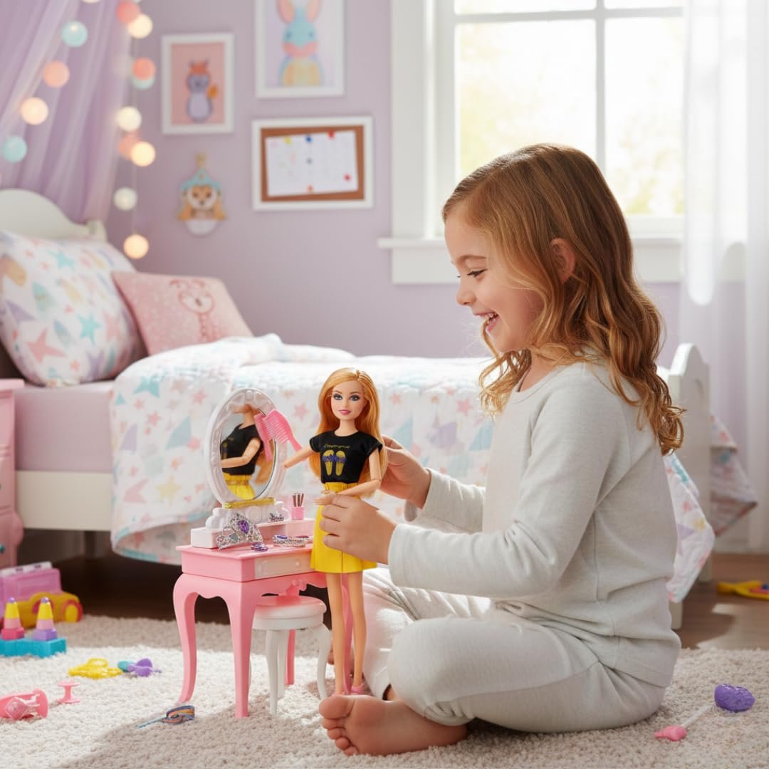 This Beauty Fashion Doll Set includes a stylish doll, a vanity table with mirror, a stool and multiple accessories for creative pretend play. Each doll comes dressed in a trendy outfit and includes jewellery pieces, a crown, fashion bags and extra styling items. Children can imagine makeover sessions, dressing-up play and everyday storytelling scenes. The accessories are lightweight, smooth-edged and safe for kids aged 3 and above. The bright colours, clean detailing and gift-ready packaging make it a strong choice for birthdays, return gifts and daily play. This set supports imaginative thinking, hand-eye coordination and independent role-play.