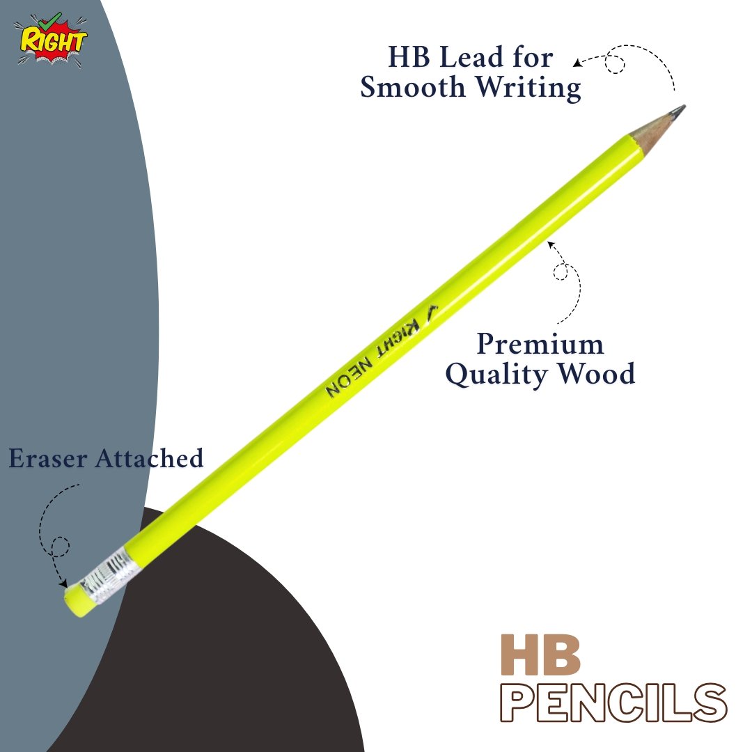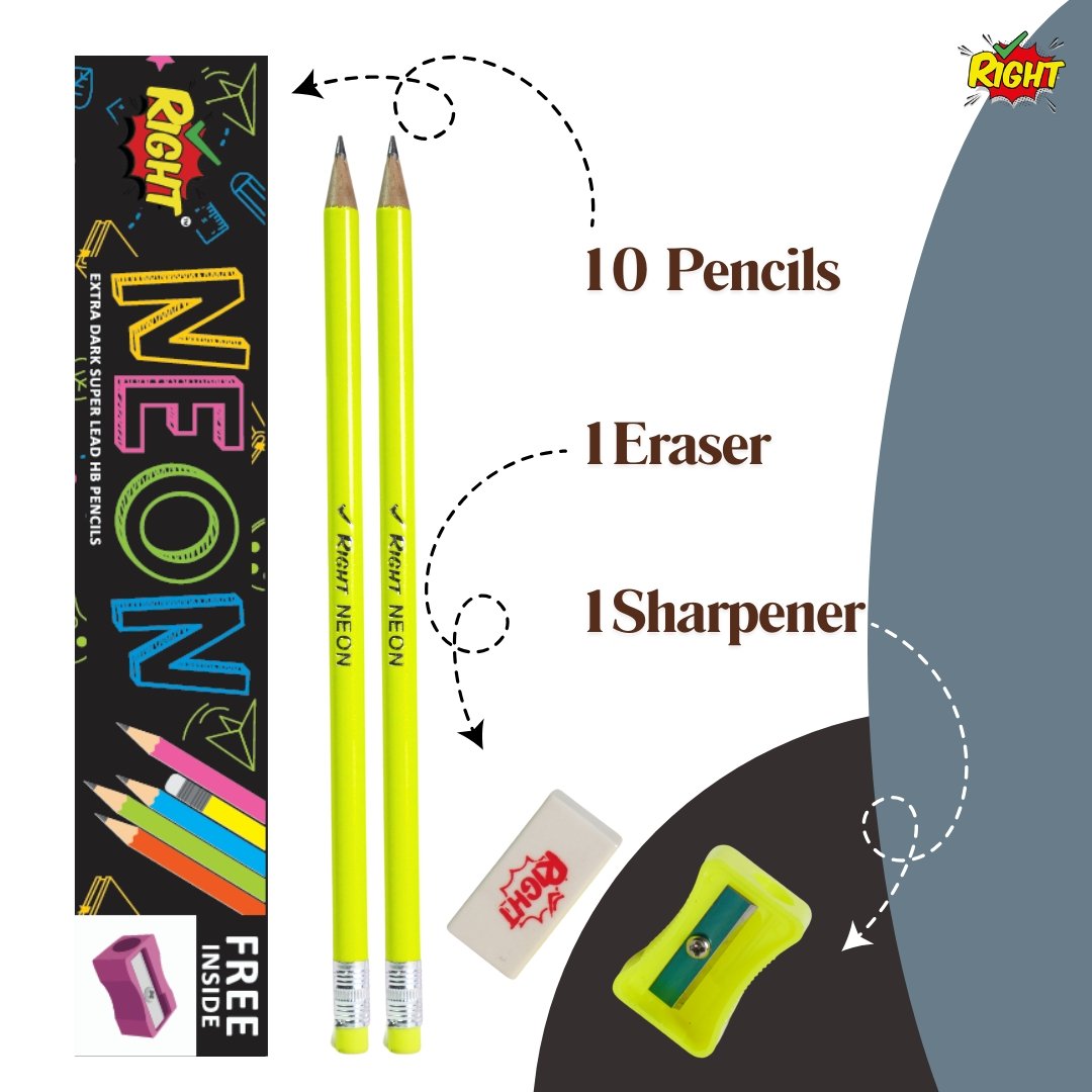 Right Neon Extra Dark HB Pencils | Super Smooth Graphite | Bright Neon Body | Free Sharpener Inside | Pack of 10 Pencils for Kids & Students